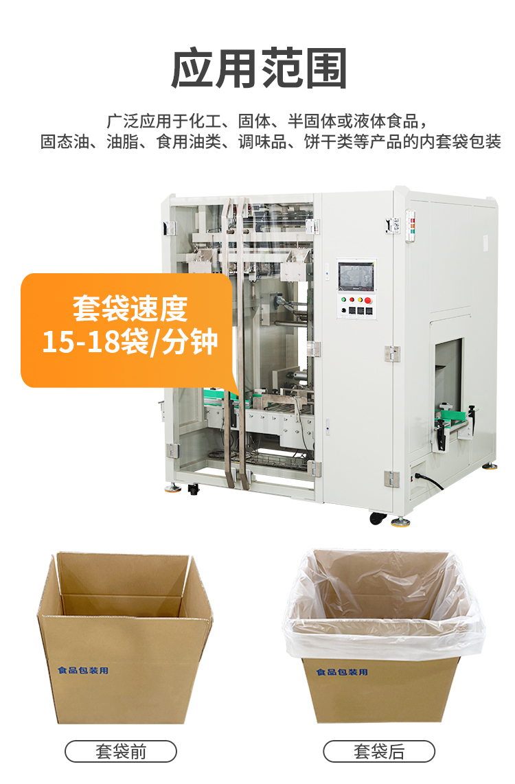 自動紙箱內(nèi)套袋機,該機采用多伺服控制,自動完成紙箱輸入、定位、卷膜輸出、入箱、切膜、折邊、紙箱輸出。自動套袋一次同步成型,無需停機,可銜接前段自動開箱機,后段自動裝箱機、自動提袋封口機和自動封箱機實現(xiàn)無人化自動包裝。該款套袋機適用PE膜材質(zhì),運用于化工、粉末、固體、半固體或液體;食品,固態(tài)油、油脂、食用油類、調(diào)味品、餅干、生鮮水果類等產(chǎn)品的內(nèi)套袋包裝。