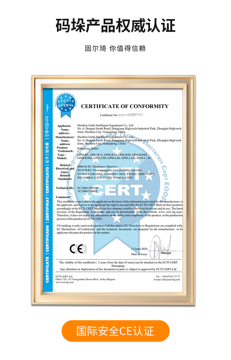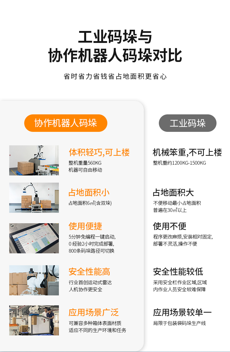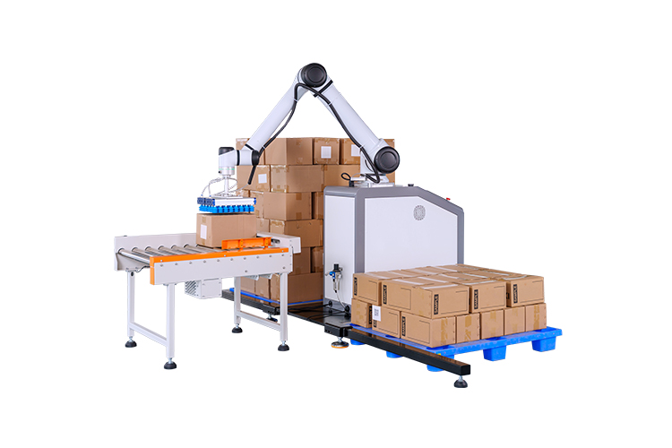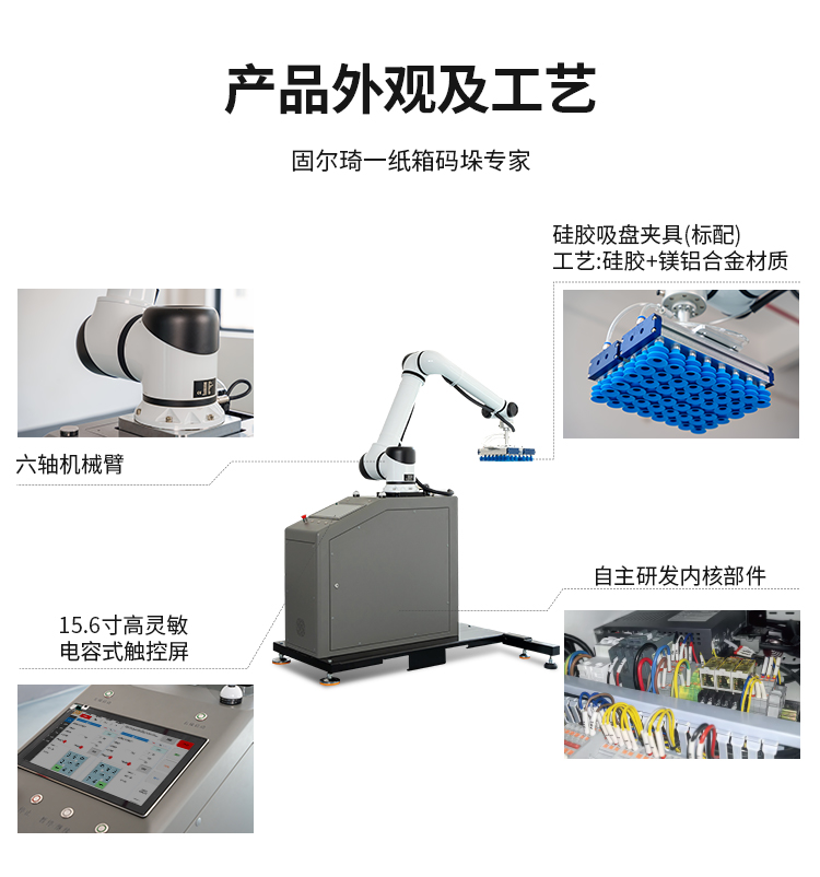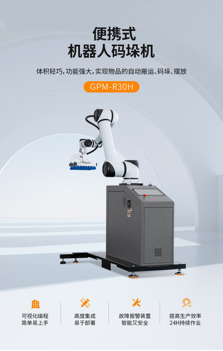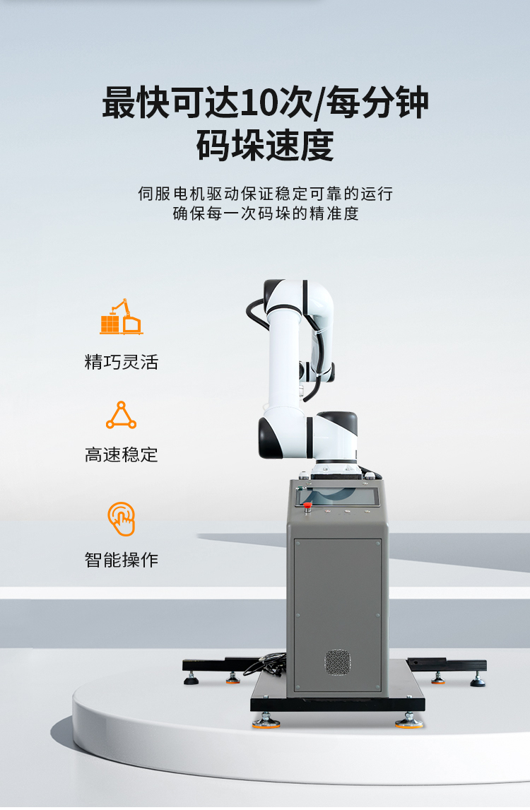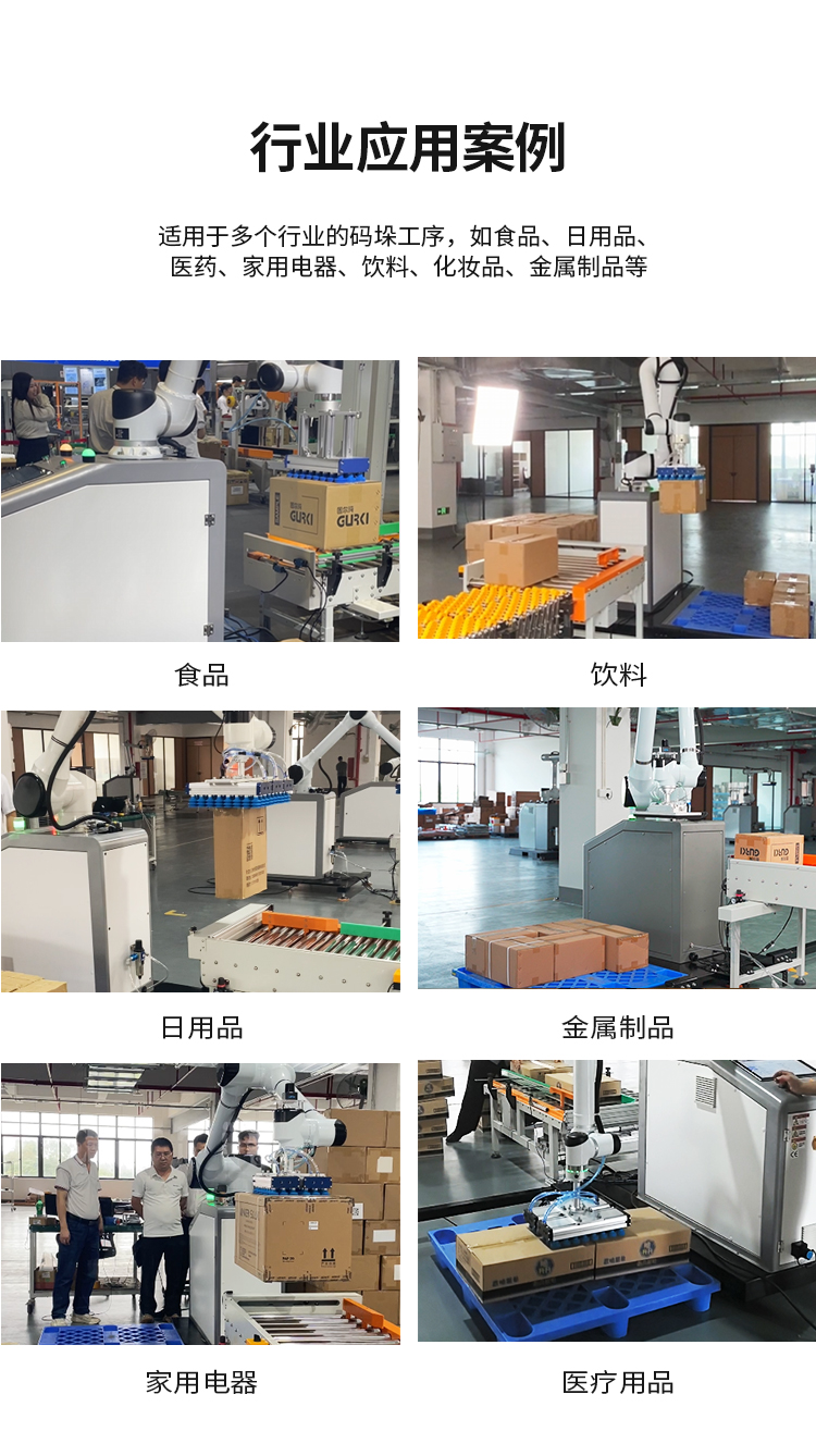協(xié)作機(jī)器人碼垛,與人類工作人員緊密合作,提高生產(chǎn)效率、靈活適應(yīng)不同任務(wù)。安全配備傳感器,為工作人員創(chuàng)造更安全高效的工作環(huán)境,外形精巧美觀,調(diào)整方便簡(jiǎn)單,本設(shè)備采用觸控屏操作,實(shí)現(xiàn)智能化操作管理,簡(jiǎn)便、易掌握??纱蟠蟮販p少勞動(dòng)人員和降低勞動(dòng)強(qiáng)度??瑟?dú)立使用也可配套自動(dòng)供棧機(jī)和棧板輸送機(jī)來(lái)實(shí)現(xiàn)全自動(dòng)碼垛系統(tǒng),廣泛應(yīng)用于多個(gè)行業(yè)的碼垛工序,如紙箱類、醫(yī)藥類、日用品、食品、飲料、化妝品、金屬制品等。