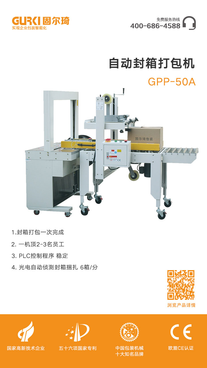 自動(dòng)封箱打包機(jī)GPP-50A的配套,使全自動(dòng)打包機(jī)和自動(dòng)封箱機(jī)為一體的包裝機(jī),可配套自動(dòng)化包裝流水線使用,自動(dòng)上下封膠帶,多道困扎,實(shí) 現(xiàn)后道無(wú)人化包裝;工作效率高,更好滿足新老顧客的需求。廣泛適應(yīng)于印刷、彩繪、賀卡、相冊(cè)、相框、醫(yī)藥、電子、日化、 化妝品等大批量生產(chǎn)的行業(yè)。