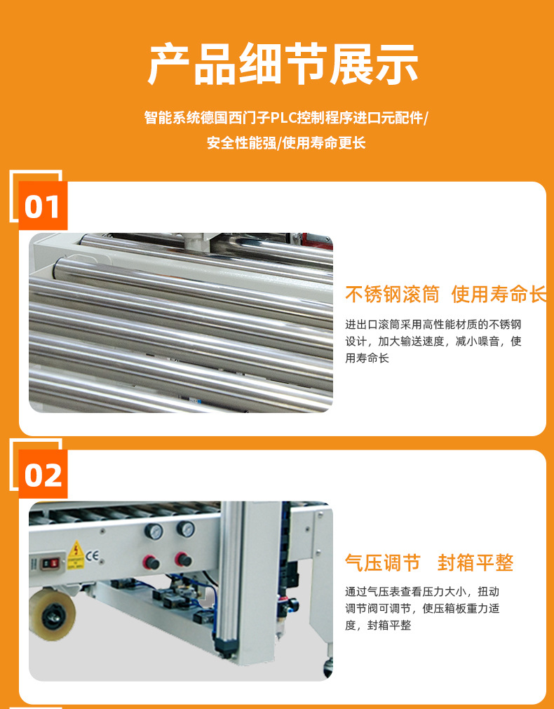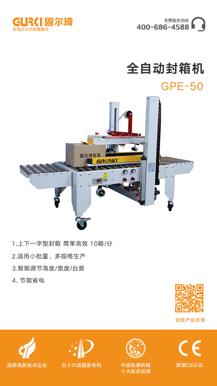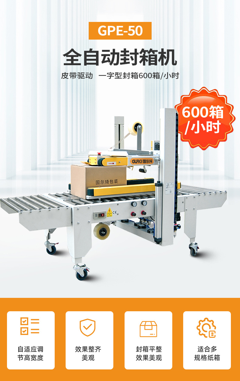 全自動封箱機GPE-50可以自動調(diào)節(jié)紙箱高度及寬度,更換不同規(guī)格紙箱無需人工調(diào)節(jié);推薦更換紙箱規(guī)格頻繁的用戶使用。該款封箱機廣泛應(yīng)用于食品、醫(yī)藥、玩具、煙草、日化、電子等行業(yè)。
