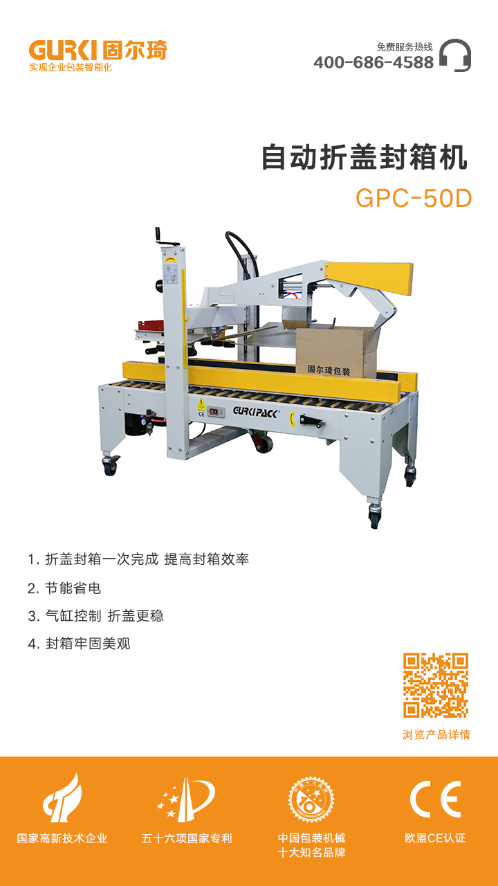 GPC-50D自動(dòng)折上蓋,上下自動(dòng)貼上膠帶,無需人手作業(yè);采用即貼膠帶紙箱封口,不僅封箱效果美觀,且封口牢固,配套自動(dòng)化包裝流水線使用將更能體現(xiàn)此機(jī)價(jià)值。該款封箱機(jī)廣泛應(yīng)用于食品、醫(yī)藥、飲料、煙草、日化、汽車、線纜、電子等行業(yè)。