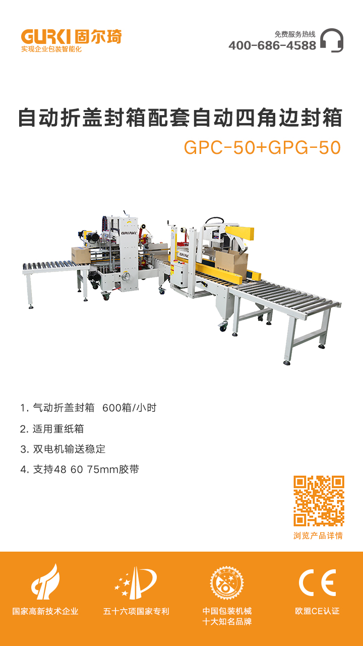 GPC-50+GPG-755E是自動折蓋封箱機與自動四角邊封箱機聯(lián)機配套,形成自動“H”型封箱,能自動折合頂蓋,輸送紙箱,上下“一”字型封箱,兩側輔助輪協(xié)助機器封箱,保證膠紙不貼歪。緊接著通過L型轉角推送,輸送進紙箱進行四角邊封箱作業(yè),簡單實用。該款封箱機廣泛應用于食品、醫(yī)藥、飲料、煙草、日化等行業(yè)。