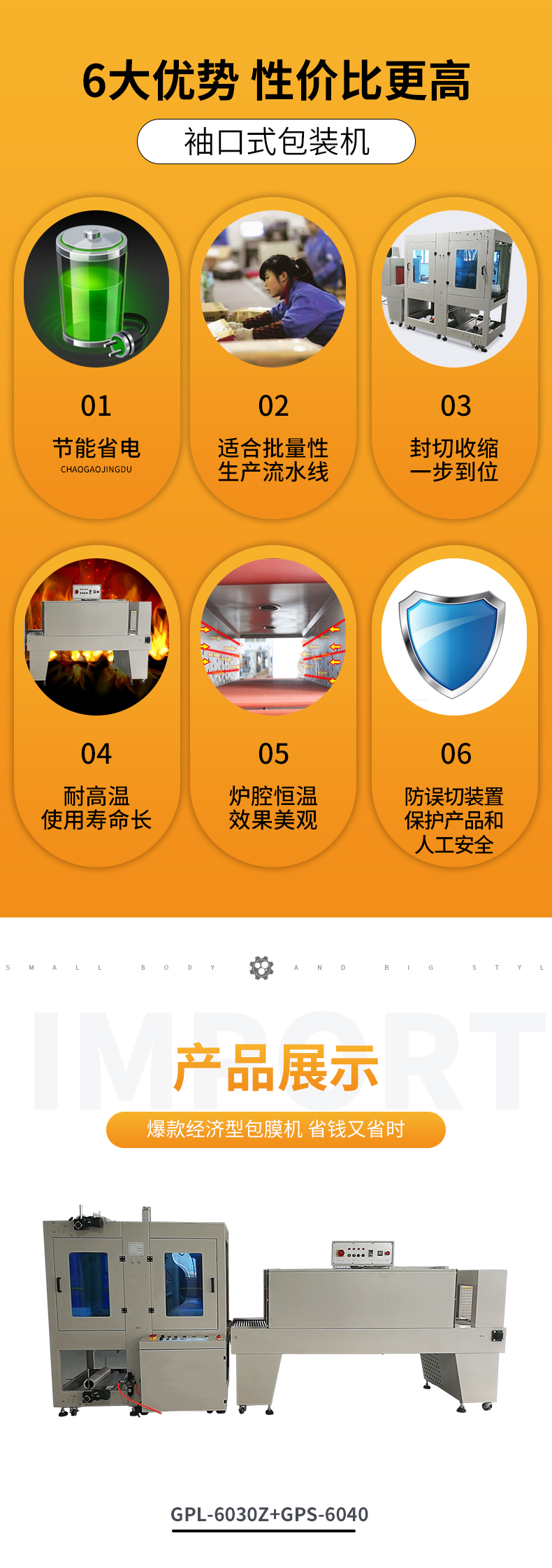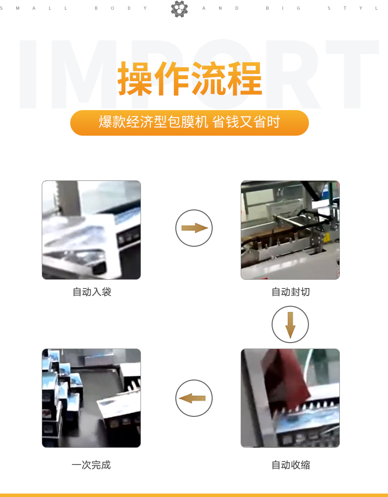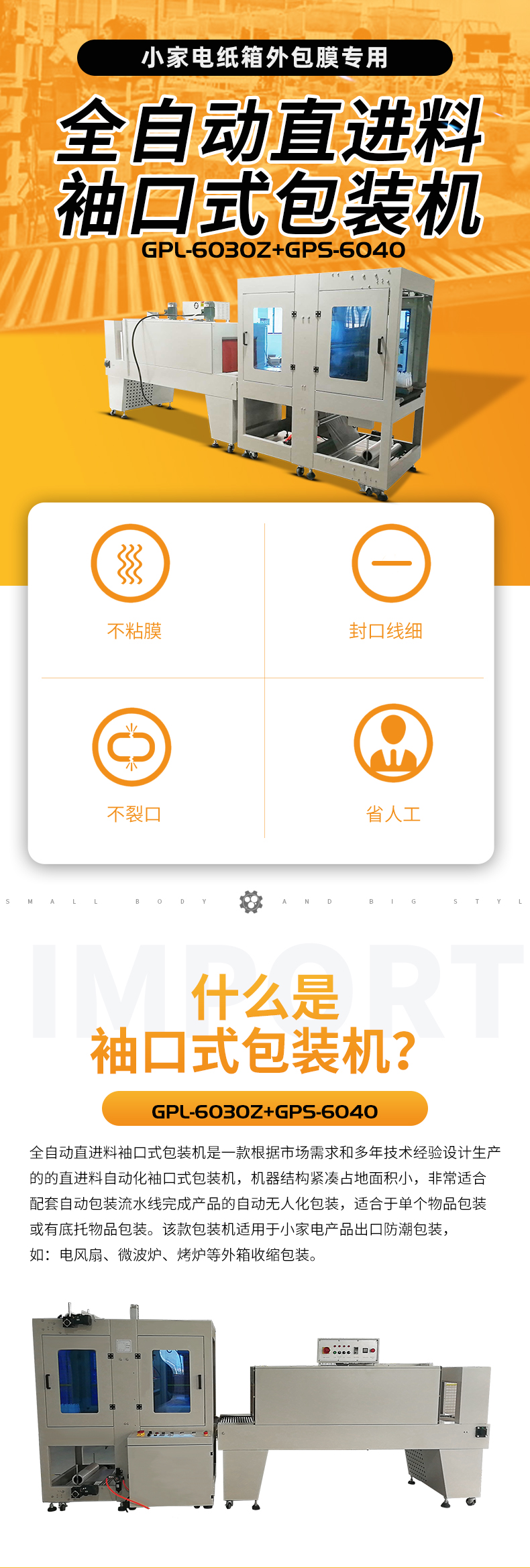 全自動直進料袖口式包裝機是一款根據(jù)多年實戰(zhàn)經(jīng)驗技術(shù)制作的直進料自動化袖口式包裝機,機器結(jié)構(gòu)緊湊占地面積小,非常適合配套自動包裝流水線完成產(chǎn)品的自動無人化包裝,適合于單個物品包裝或有底托物品包裝。 該款包裝機適用于小家電產(chǎn)品出口防潮包裝,如:電風(fēng)扇、微波爐、烤爐等外箱收縮包裝。